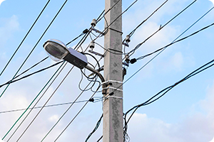 • Overhead light: Installed on utility pole with electric overhead wire visible