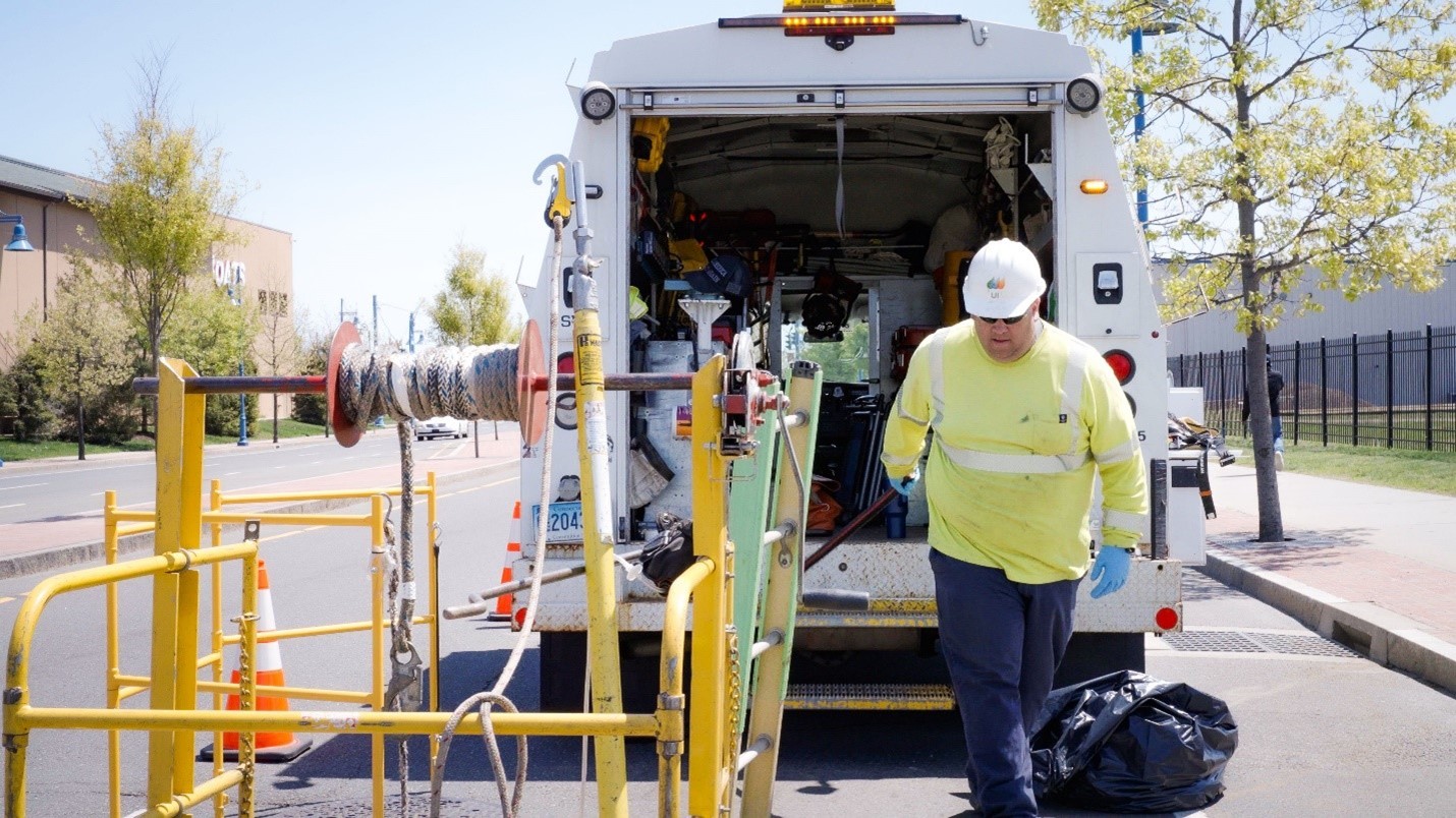 A member of UI’s underground distribution team prepares to descend into a splice chamber in the Steelpointe Harbor area, across from Bass Pro Shops