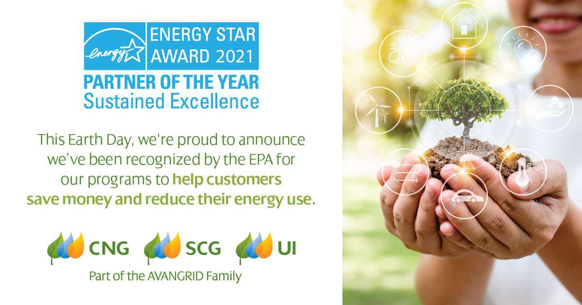 ORANGE and EAST HARTFORD, Conn. — April 23, 2021 — The U.S. Environmental Protection Agency and Department of Energy have once again recognized United Illuminating (UI), Southern Connecticut Gas (SCG) and Connecticut Natural Gas (CNG) for their ongoing work to help customers reduce energy bills and fight climate change through the ENERGY STAR program.